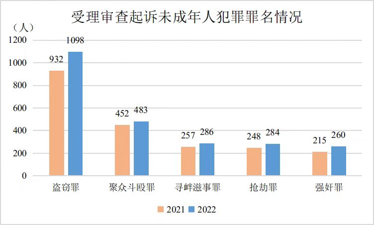 1.未成年人犯罪罪名集中。受理审查起诉未成年犯罪嫌疑人数量居前五位的分别是盗窃罪1098人、聚众斗殴罪483人、寻衅滋事罪286人、抢劫罪284人、强奸罪260人。该五类犯罪人数占受理审查起诉未成年人犯罪总人数64.6%。