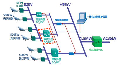该项目在国家能源大型风电并网系统张北研发试验基地建成了1.5MW光伏直流升压并网实证平台,该平台包含三台500kW/±35kV光伏中压DC-DC变流装置,其中中频隔离型装置由我校午夜AV