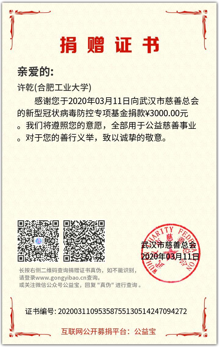 近日,电气与工程学院电气工程及其自动化专业17级本科生许乾同学,将自己大二学年获得的3000元社会捐资奖学金全额捐赠给了武汉市慈善总会,用于支持新冠肺炎疫情防控。