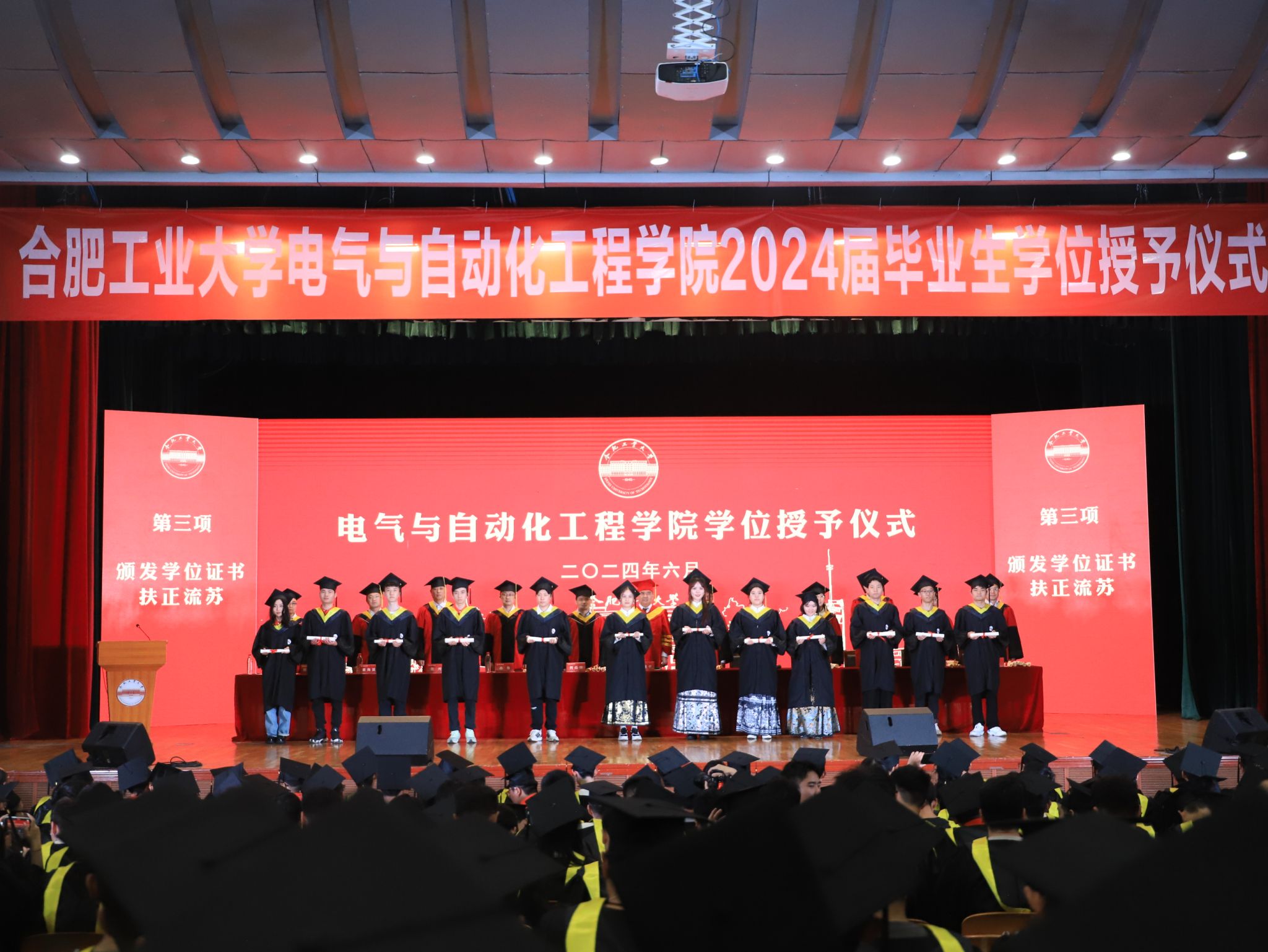 2024届合肥校区毕业生学位授予仪式在屯溪路校区斛兵礼堂举行。校党委常委、副校长刘晓平出席仪式,学院相关负责人、学位评定委员会委员、教师代表、学生家长代表、校友代表以及2024届学士、硕士、博士学位获得者参加仪式。仪式由学院副院长黄海宏主持。