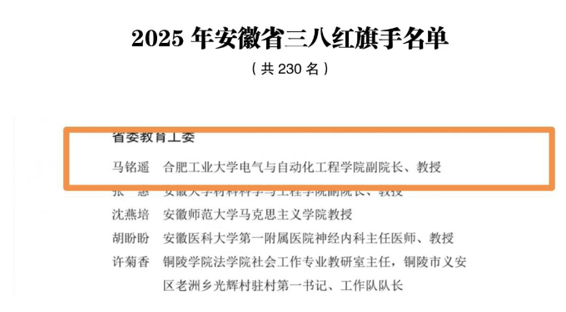 日前,为表彰先进、树立榜样,激励广大女性自尊自信、自立自强,奋进新征程、建功新时代,安徽省妇联集中授予一批安徽省三八红旗手标兵称号、安徽省三八红旗手称号和安徽省三八红旗集体称号。我院马铭遥教授光荣上榜,获得安徽省三八红旗手称号!
