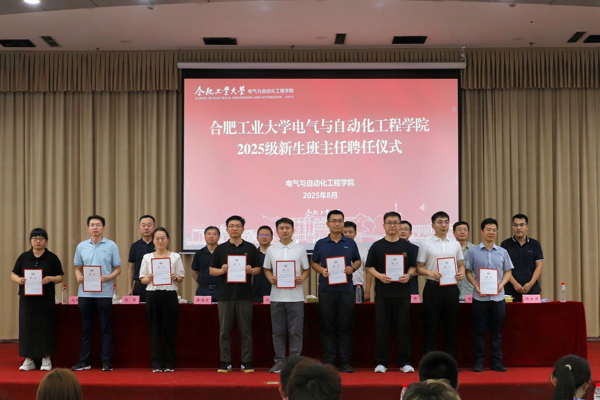 学院党委书记冯航代表全院师生向2025级新同学表示热烈欢迎与衷心祝贺,他勉励全体新同学树立远大理想、明确奋斗目标,勤奋学习、勇于创新,注重实践、提升综合能力。电气工程、自动化、电工电子三个系的负责同志分别就各学科的科研特色、研究领域与行业发展前景作了系统介绍。与会领导为新聘任的12名2025级班主任颁发聘书并合影留念。会议由学院党委副书记兼纪委书记张栋主持。