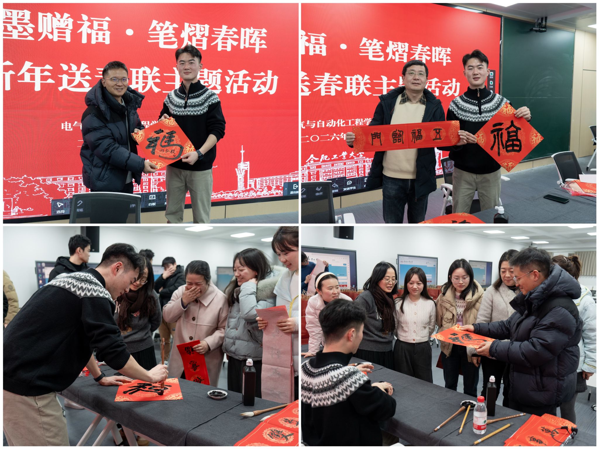 在逸夫楼1005会议室举办“翰墨迎春,福满电院”送春联活动。教师代表、大学生书画协会学生代表,为全院教职工现场书写春联、定制福字。