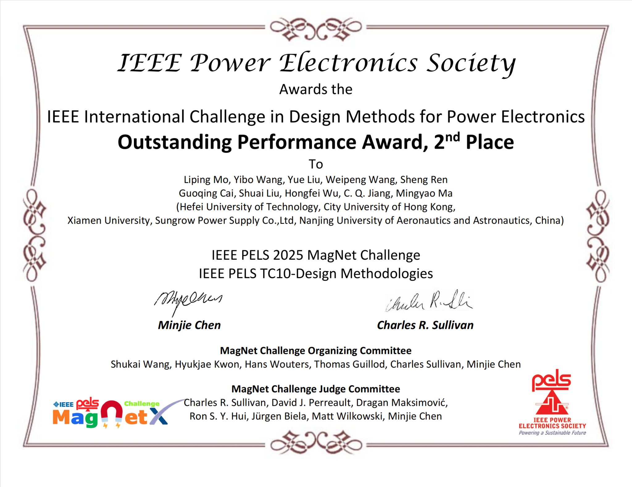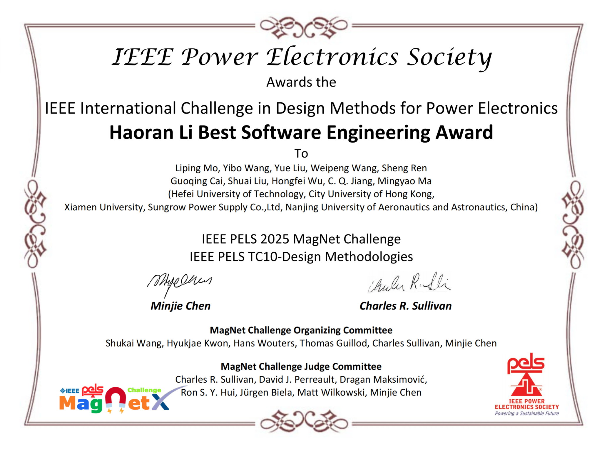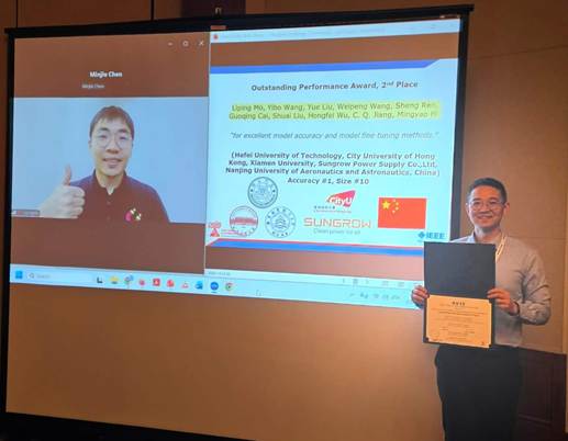 恒爱精诚团队莫李平牵头,联合香港城市大学、厦门大学等高校组建的跨校联合战队HFUT-CITYUHK-XMU,在产业指导香港城市大学江朝强教授的悉心引领和阳光电源股份有限公司的全力支持下脱颖而出,一举斩获杰出性能奖全球第二名、最佳软件工程奖全球第一名(全球唯一)的佳绩,揽获赛事奖金10000美元,成为本次大赛亚洲地区唯一获奖队伍,也是本届大赛中唯一一支同时斩获两项大奖的参赛队伍,充分彰显了我校在电力电子磁建模领域的国际领先水平。
