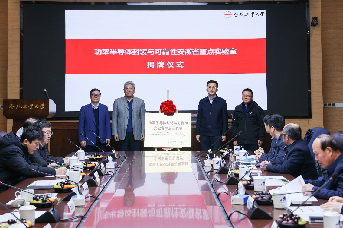 的建设发展,不断深化与学校的交流合作,共享新思路新经验新方案,推动相关学科科研平台更好的发展。随后于祥成、华北电力大学崔翔教授、“功率半导体封装与可靠性安徽省重点实验室”实验室主任丁立健教授共同为“功率半导体封装与可靠性安徽省重点实验室”揭牌。