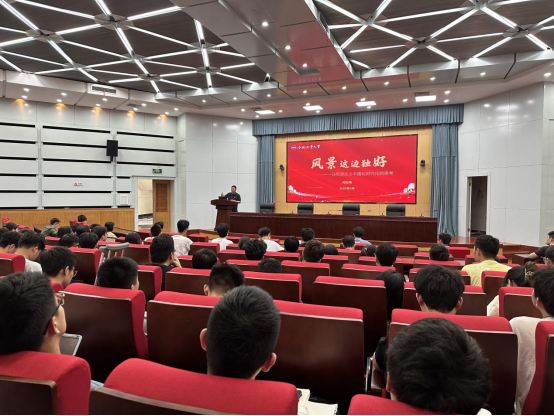 闫志伟以“风景这边独好——马克思主义中国化时代化的思考”为题,从马克思主义影响世界伟大觉醒、揭示人类社会发展规律、指引政党开辟道路三方面介绍了马克思主义的重要意义,指出马克思主义犹如壮丽的日出,照亮了世界,也照亮了中国,有了星火,便可燎原。随后,他介绍了马克思主义中国化的发展路径,指出100 多年来,一代代中国共产党人坚持把马克思主义基本原理同中国具体实际相结合,形成了毛泽东思想、邓小平理论、三个代表、科学发展观,习近平新时代中国特色社会主义思想,科学解决了中国革命、建设和改革中的重大课题并取得诸多伟大胜利,其背后是马克思主义不断中国化时代化的孕育发展的结果。最后他结合党的二十大报告,从马克思主义行在其新、行在其善、行在其用三方面,结合具体事例为全体学员解读马克思主义为什么行,并激励全体学员坚定不移跟党走,坚持道路自信、理论自信、制度自信、文化自信,将小我融身大我,以实际行动彰显青春风采。刘小通以“旗帜引领方向,使命凝聚力量”为题,向全体学员解读了党的二十大报告中总书记对当代青年的寄语,从紧跟党的脚步,推翻三座大山;追随党的荣光,建设富强中国;听从党的号召,投身改革热潮;赓续党的血脉,奋进第二百年四个方面介绍了历史长卷中一代代中国青年勇挑重担、艰苦创业、保家卫国、开拓进取、接续奋斗、振兴中华的伟大精神,激励广大青年用臂膀扛起如山的责任,展现出青春激昂的风采,做有理想、有担当、能吃苦、肯奋斗的新时代好青年。