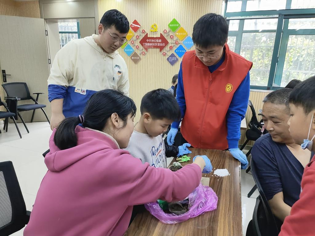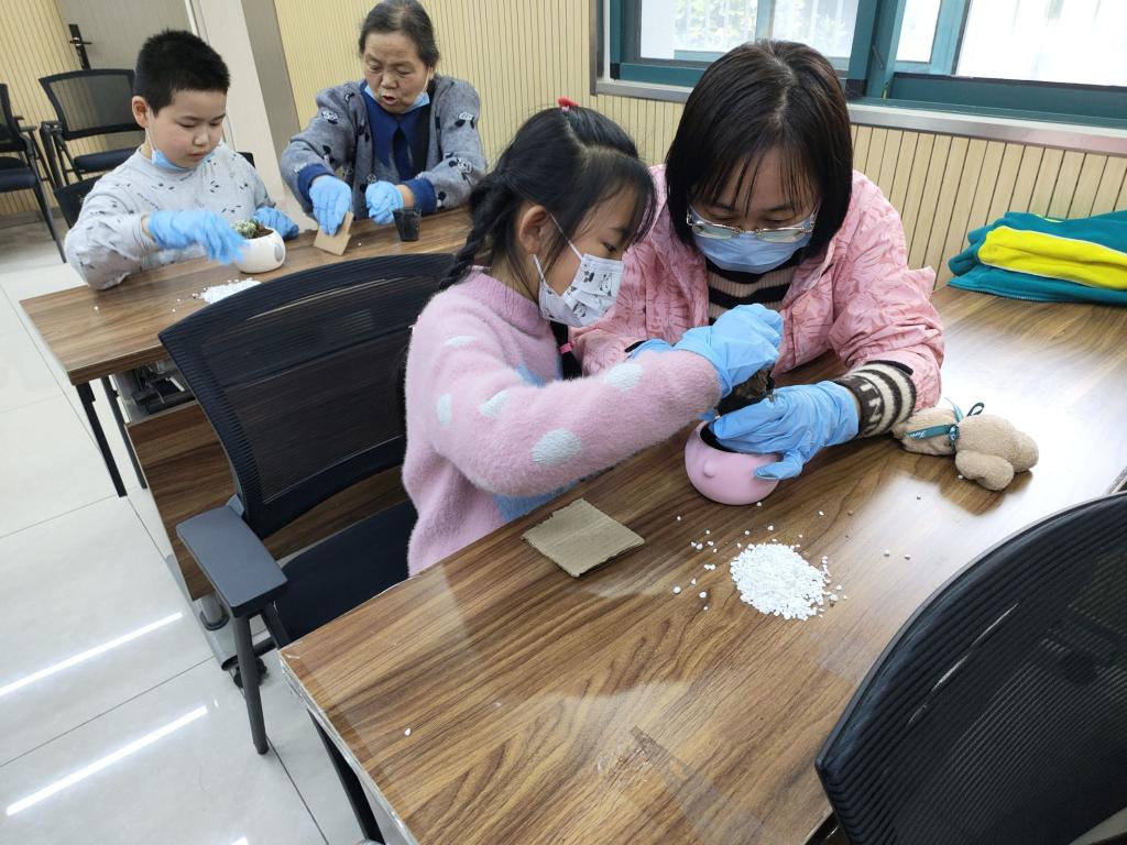 阳光志愿服务中心与宁国新村社区开展“春风如约至,绿植进万家”志愿服务活动。社区儿童在家长的陪伴下参加活动。