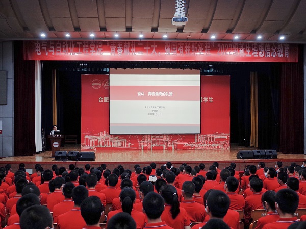 “青春献礼二十大,强国有我新征程”学生理想信念教育专题活动在斛兵礼堂举行,学院党委相关负责人、2022级辅导员和全体本科新生参加活动。