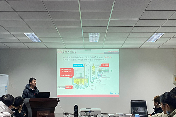 第一位分享者是于新龙同学,他汇报的主题是:快堆中永磁式钠流量计原位校准技术研究。针对了大口径永磁式钠流量计目前存在的问题,于新龙同学基于磁场和流场相互作用的非线性原因进行分析,提出基于信号频带选择的非线性校正方法,实现了一种低频抑制的误差修正方法。同时于新龙同学和现场的同学们分享了自己科研的方法以及查阅书籍的技巧心得。