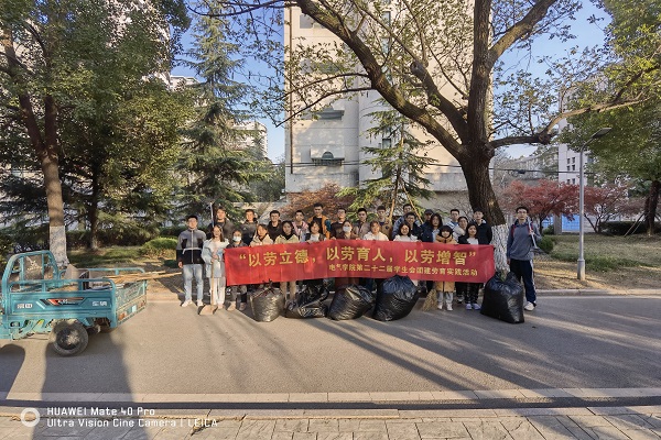 第22届学生会全体成员在学生社区服务大厅前开展劳动教育实践活动。