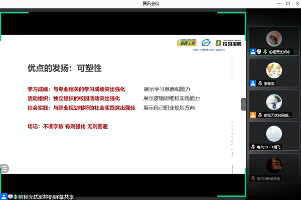 举行“AI趋势化简历技能”线上讲座。活动邀请了前程无忧校园部经理王恒帅全程在线互动,前程无忧校园招聘部项目执行经理郭婷老师担任主讲,百余名同学参加在线培训。