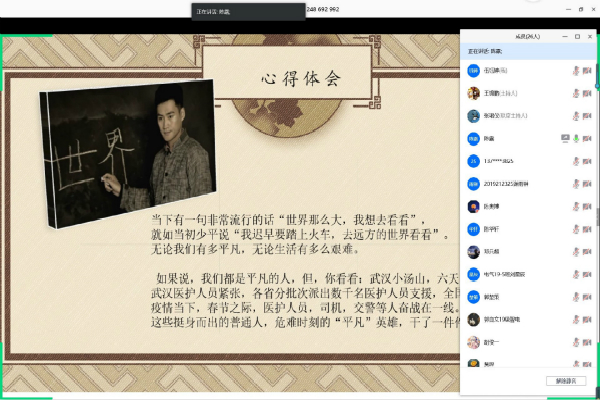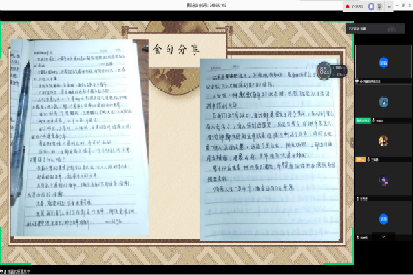经过班级推荐,学院初评,最终选出30篇优秀读书笔记。3月29日下午,30位获奖同学参加了线上读书分享会。依托腾讯会议平台,同学们畅所欲言,详细阐述了读书过程中的心得与收获,并积极分享自己的读书笔记。活动中,针对同一本书,多个同学从不同的角度分享了自己的看法与见解,如《万历十五年》,有6位同学从各自理解的范围对该书进行了背景分析、内容阐释、文字欣赏与主旨理解。在整个分享会过程中,同学们描述了所选书籍的精彩内容,同时积极与当下实事紧密结合,以丰富多彩的分享模式、精妙绝伦的文字表达和饱满流畅的情感渲染,向其他同学展示了自己创作读书笔记的初衷以及阅读该书籍对自己的影响,李千年同学在分享时还别出心裁地用陕西话念了《秦腔》中的一段文字,获得一致好评。