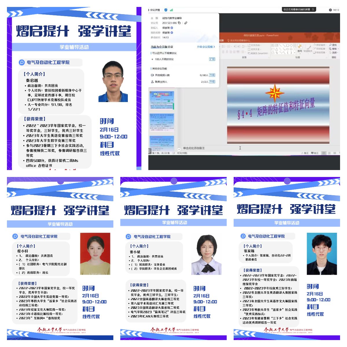 开展“‘熠’启提升,强学讲堂”线上学业辅导活动,学院建立“骨干教师+朋辈讲师”学业导师队伍,各年级调研摸排学生需求,针对《电力电子技术》,《电子技术基础》,《线性代数》,《工程图学》等课程开展学业辅导,帮助学生掌握学习方法,把握重点难点,增添学习动能,树立学业信心,顺利通过考试,学院150余名学生参加活动。