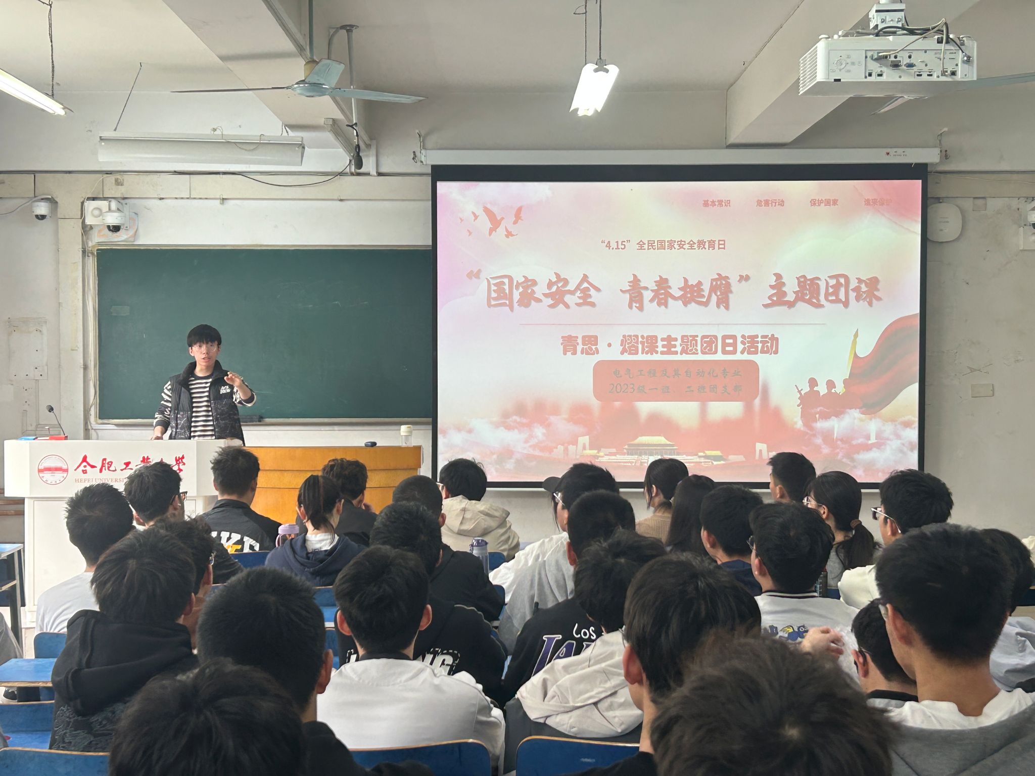 于西二教学楼203教室开展青思·熠课”主题教育暨“国家安全,青春挺膺”团日活动,电气工程及其自动化专业2023级一班、二班团支部全体同学参与活动。