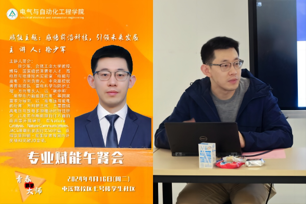 4月16日,国家级优秀青年人才、中央高校优秀青年团队“雷电科学与防护工程”方向带头人、欧盟玛丽·居里学者获得者徐少军教授应邀参加第五期“青春遇见大师”专业赋能午餐会,与电气工程及其自动化专业学生代表相聚屯溪路校区七号楼沙龙空间,畅谈专业、共话成长。