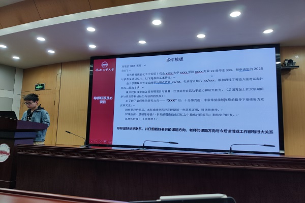 活动在轻松而热烈的氛围中展开。推免至西安交通大学的田一麟以“四载青春,一‘研’为定”为题分享了宝贵经验。他认为,保研之路并非坦途,要以明确目标和坚定信念为支撑,以扎实基础和提升能力为基石,以关注动态和充分准备为驱动,以积极交流和资源整合为助力,他鼓励大家迎难而上,直面挑战。推免至湖南大学的谭恒元重点强调了选对研究方向的重要性,建议同学们要综合考量个人兴趣、学术背景、市场需求等因素,科学分析学科设置,逐步明确研究方向,选定契合心仪导师,奠定坚实学术基础。