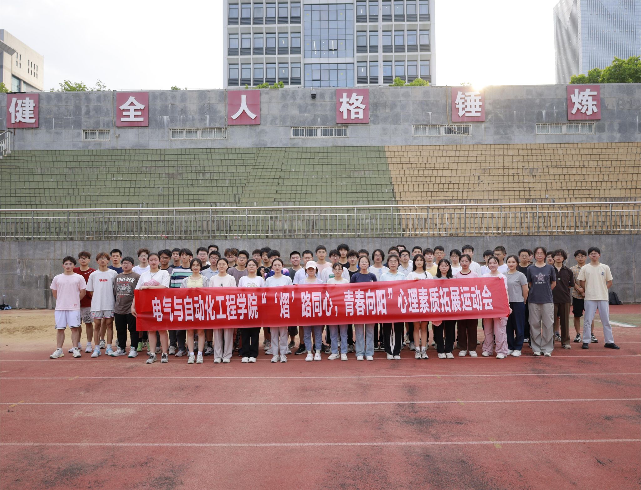 在屯溪路校区足球场开展“‘熠’路同心,青春向阳”心理素质拓展运动会。学院相关负责老师,本研各年级组成的5支队伍共计100余名学生参加活动。