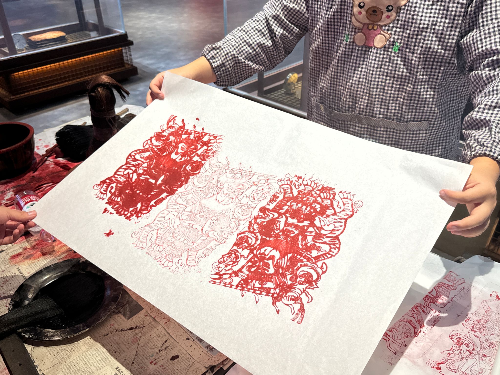 识故得以知方向。在山东博物馆中,馆内相关负责人以木版年画的艺术起点为伊始,重点围绕木刻工具的融合进步、艺术形式的高速发展与非遗形态的显著扩展进行介绍,讲述了木版年画在五千年风雷激荡间技艺流转的长久故事。各色派别的匠人推陈出新,与时代背景接轨融合,共同推动艺术体裁的改变和发展。从传统门神到劳动人民、从仅有男像到男女平等,团队成员在调研过程中再次刷新了对“木版年画”的认识,大家纷纷表示,年画作为时代的记录体,将历史的掌故、时代的特征、人文的魅力深深地烙刻在了木色的雕版上,但却绽放出了中华文化哲思深远、载体多样、形式丰富的炫目光彩。