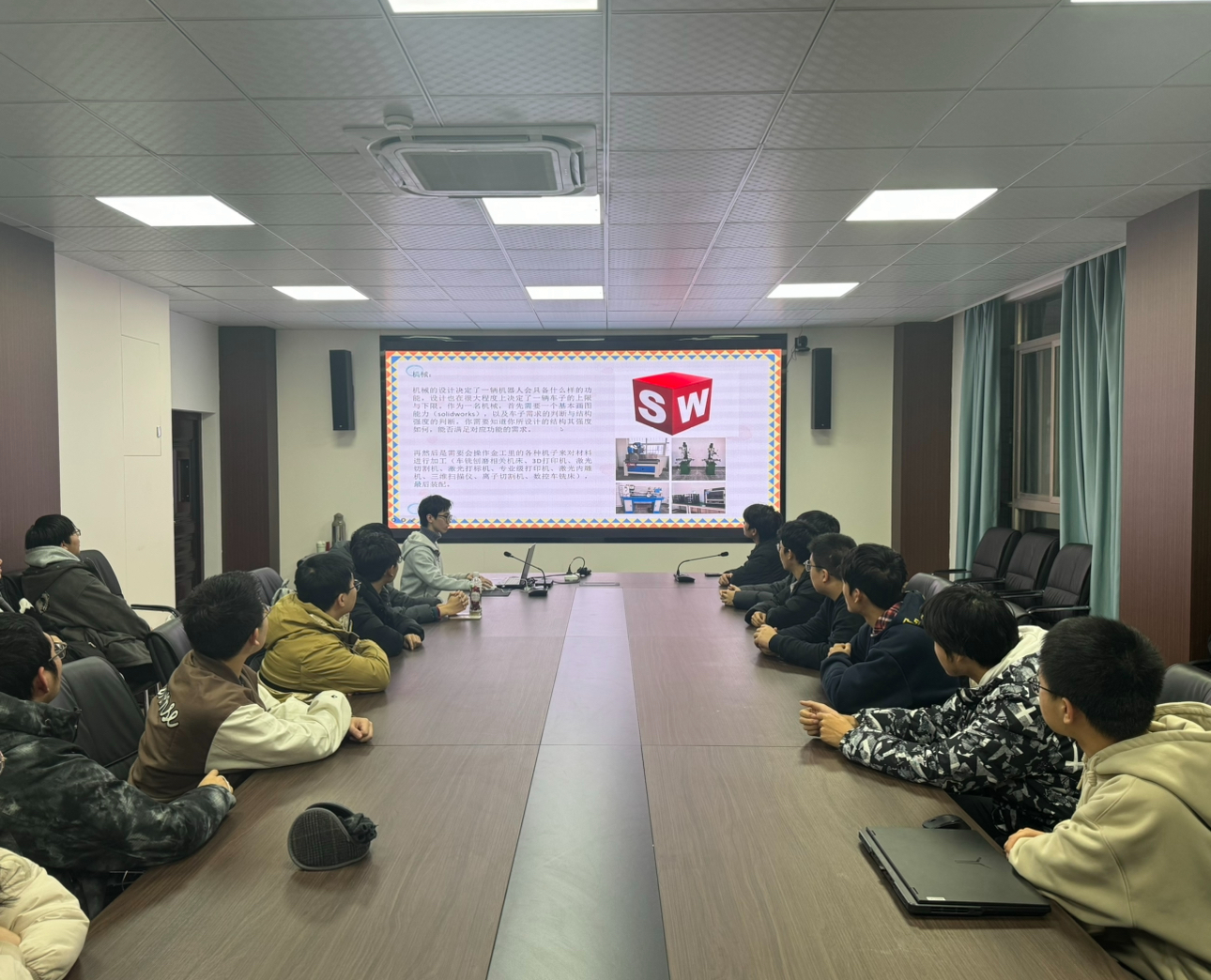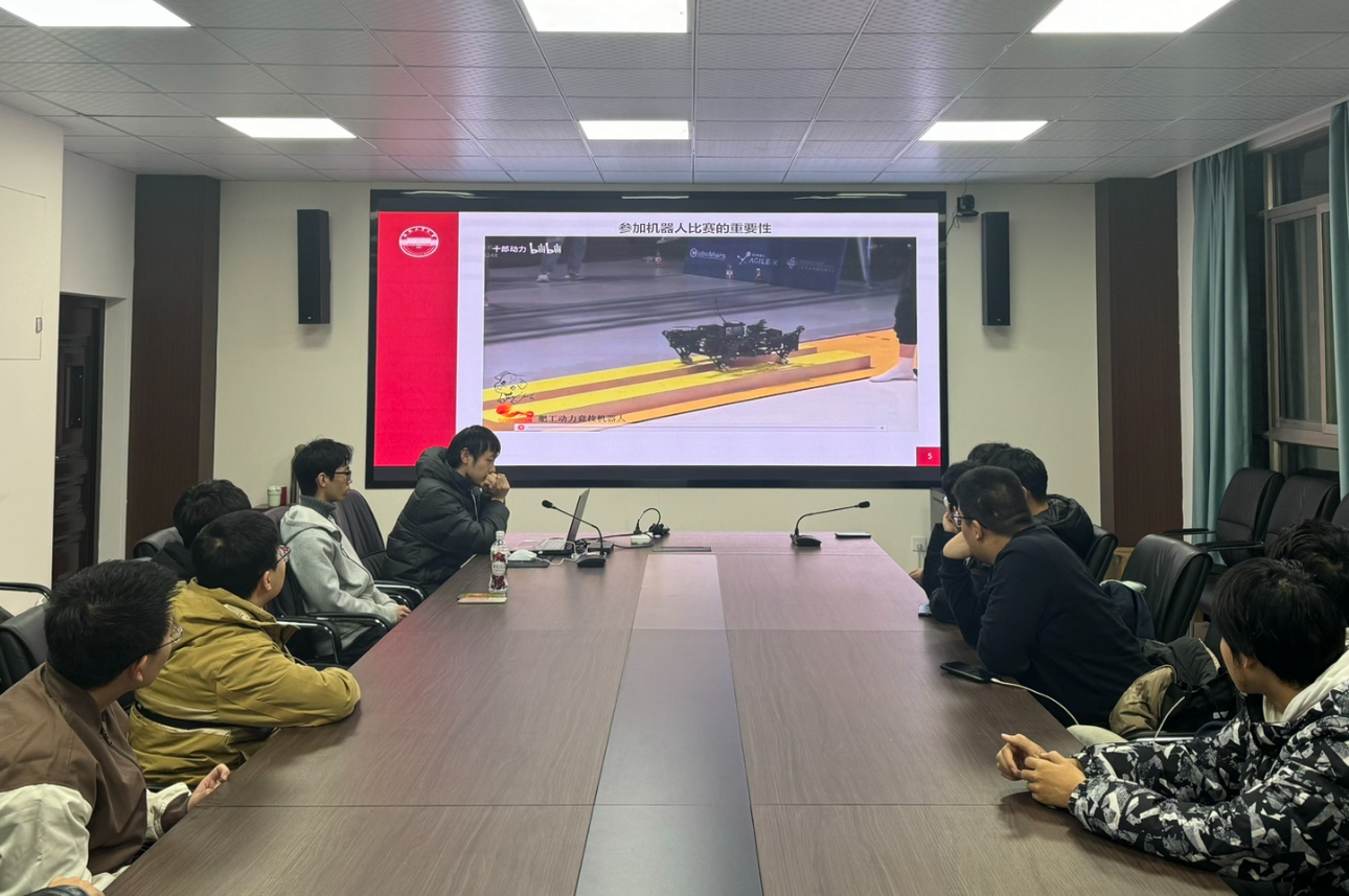机器人工程专业2023级1班的郑卜俊宏同学,从机器人竞赛的起源、赛程安排、奖项类别等多个维度出发,详尽阐述了从选题策略、团队组建、信息搜集、方案设计到机器人原型开发与调试的完整链条。他不仅深入分享了备赛过程中遭遇技术瓶颈的破解策略、团队内部的高效沟通与协作机制,还谈到了面对挑战时的心理调适方法以及严格的时间规划与执行技巧。通过分享自己从机器人领域的初学者到熟练掌握各项技能的全过程,他进一步强调了扎实基本功对于机器人学习的重要性。他用自己的亲身经历告诉大家,无论是理论学习还是实践操作,都需要一步一个脚印,稳扎稳打,才能在机器人竞赛中脱颖而出,取得优异的成绩。机器人工程专业2023级2班、苍穹战队成员何兆卓同学结合近年来学校在RoboMaster高校系列赛中取得的成绩,为众人深入解读了这一赛事的内容。在交流中他谈到,参与这项高水平的机器人竞技赛事绝非仅凭一腔热血就能轻易驾驭。参赛者不仅需要拥有电子工程、计算机科学、机械设计等交叉学科的知识,更需在复杂多变的比赛环境中迅速定位问题并高效解决。更为重要的是,RoboMaster强调团队协作的力量,它要求每一位成员不仅要成为各自领域的“专家”,还要具备出色的团队合作精神,能够在紧张激烈的比赛中迅速响应、默契配合,共同克服难关。他勉励同学们跨领域学习,打破专业壁垒,拓宽学习视野,以促进团队内部的有效沟通与协作。
