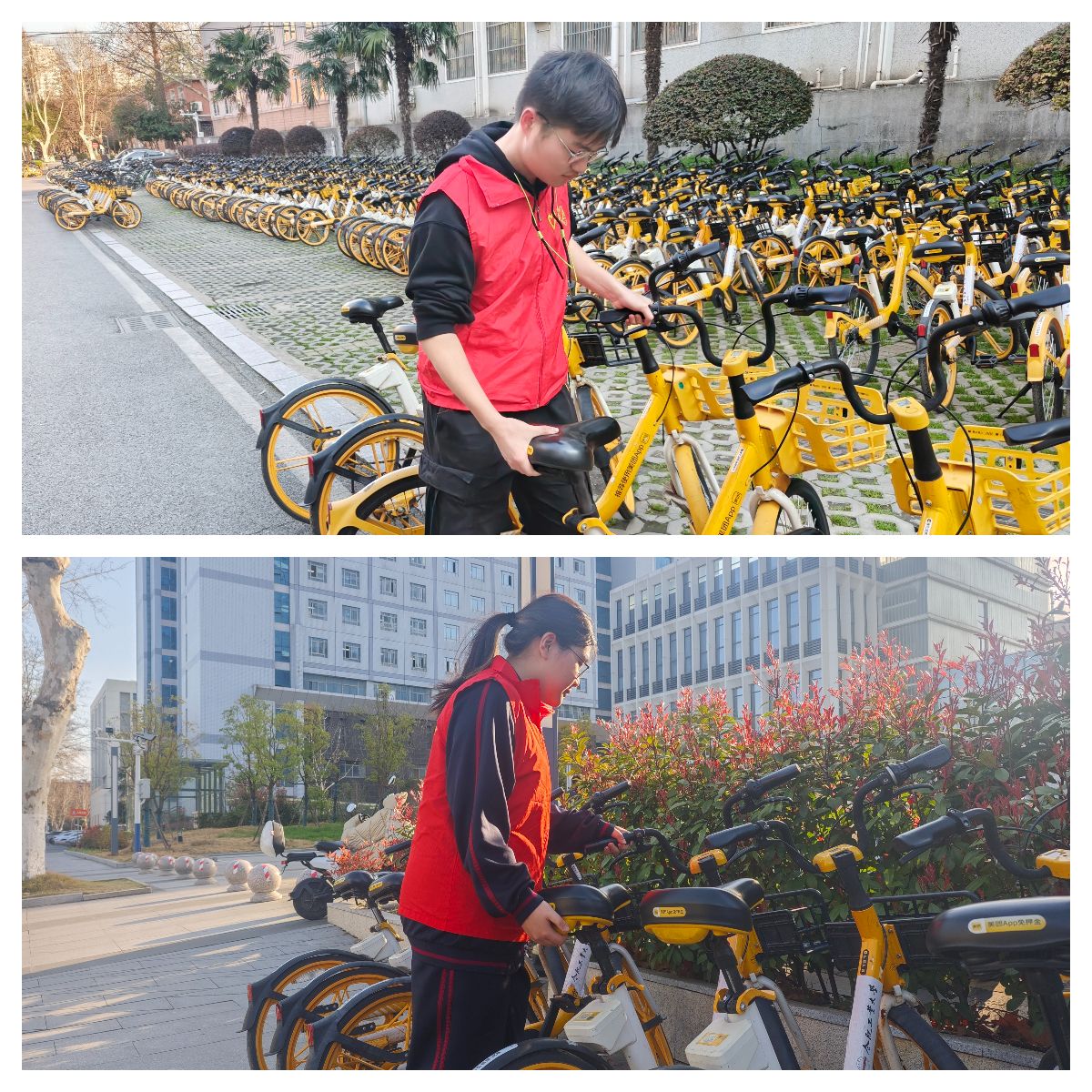 志愿者在校内开展“熠动单车,文明同行”共享单车规范管理志愿服务活动,通过清洁维护、有序归置、文明宣导等行动,号召师生共同守护校园秩序,传递文明风尚。
