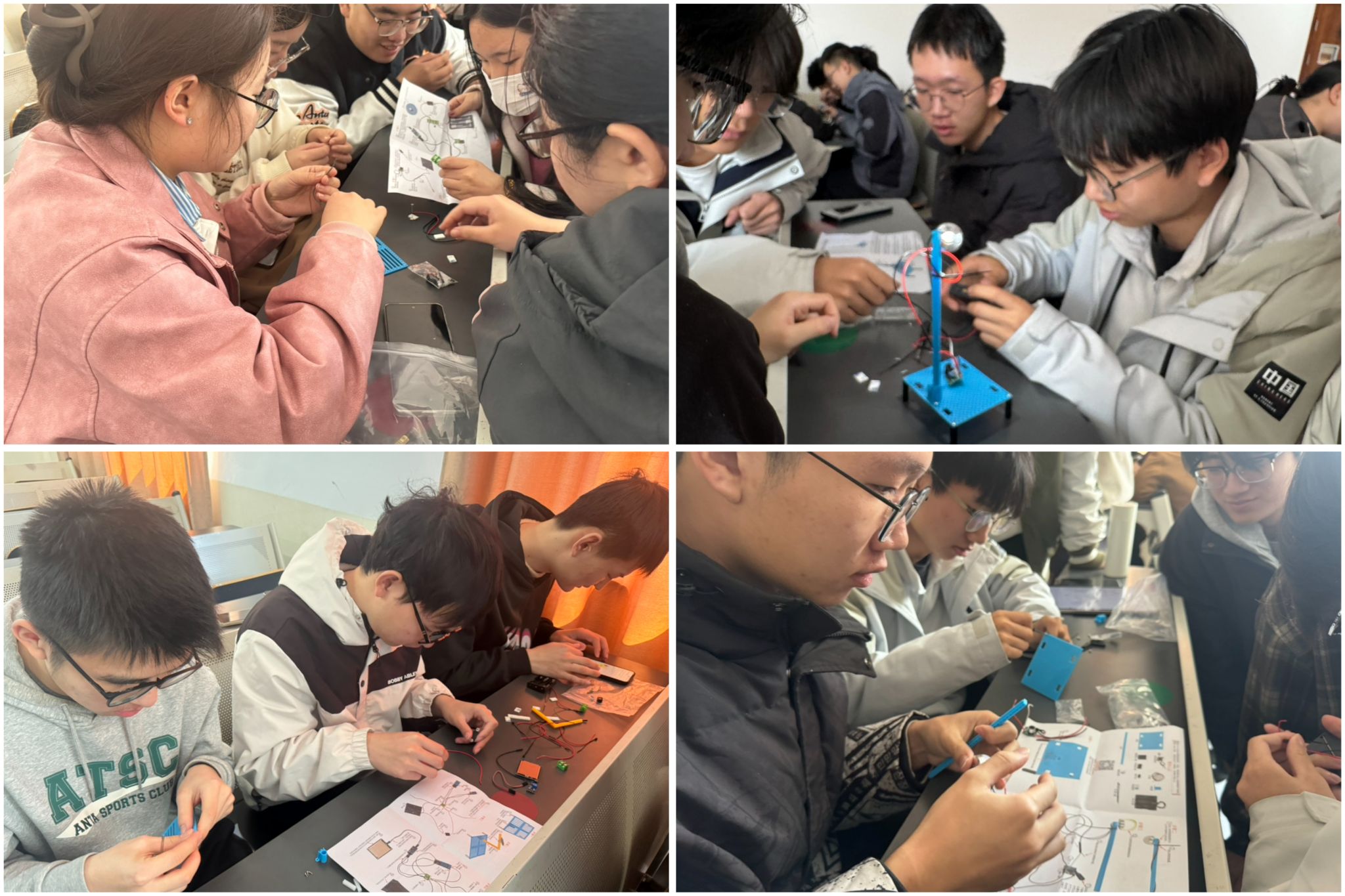 智造非凡,开启创想之旅。活动伊始,同学们围绕声光控感应灯、火灾报警器、下雨报警器等模型展开热烈讨论,并着手实践拼装。分组任务下达后,同学们迅速投入到科学模型的搭建,有的负责机械组装,有的专注电路排布,有的研究运作原理,在团队配合中不断提升实践能力。现场气氛热烈,同学们初次近距离探究机器人系统内部的电路搭建,组合各类功能模块,感受电子技术与机械构造交织蕴含的奥秘与乐趣,不仅掌握了电路知识与实操技能,更将创新巧思融入每个搭建环节,充分展现了青年的锐意进取的探索精神和蓬勃的创新活力。
