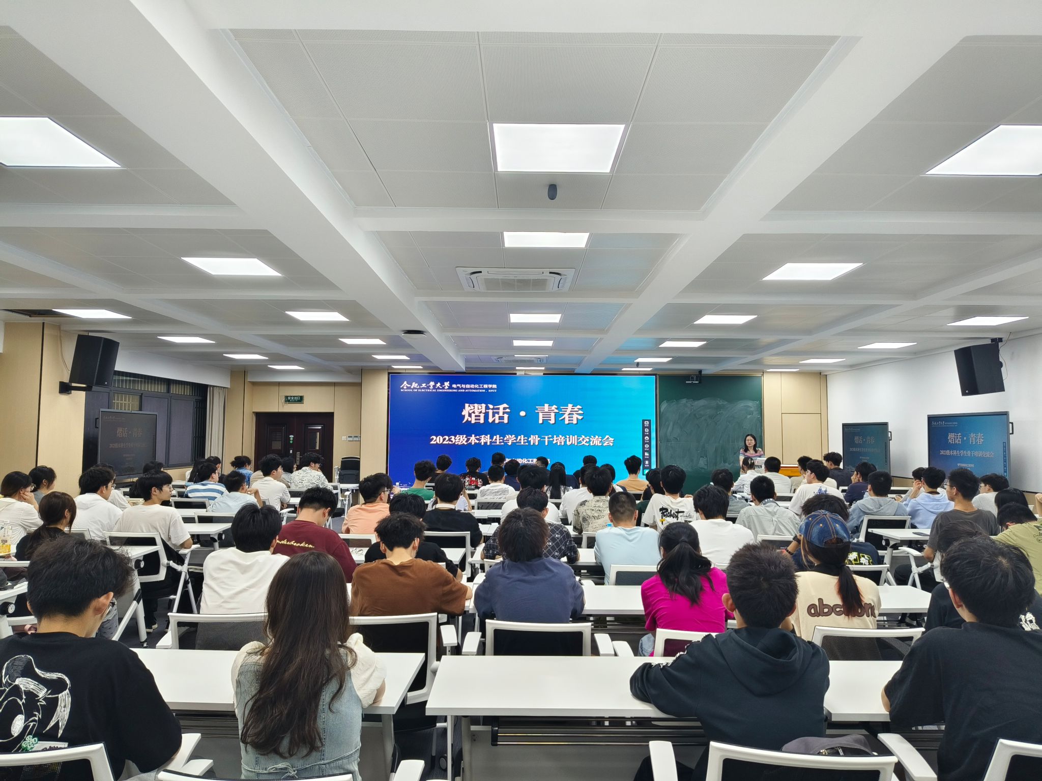 于逸夫楼1005会议室开展“熠话·青春”学生骨干培训交流,学院相关负责老师、2023级全体本科学生骨干参加活动。