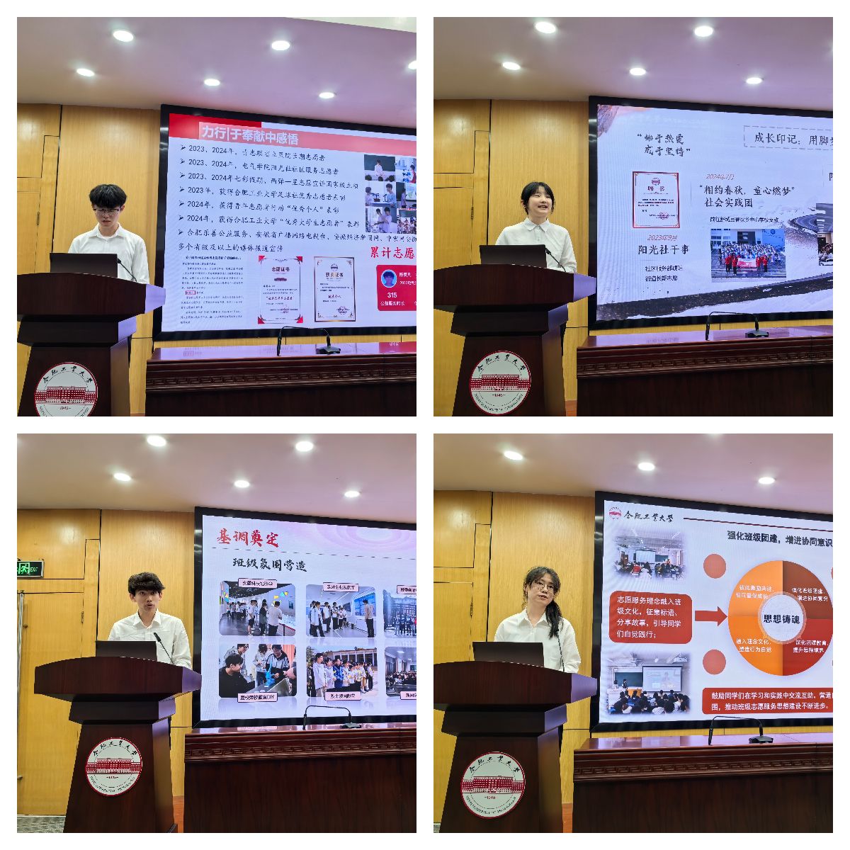 分享交流环节,十佳大学生志愿者代表分主题开展志愿服务经验分享,陆雨欣以《以热爱为峰,以坚持为杖》为主题分享了自己的志愿服务经历和心得感悟,激励青年学子在服务奉献中实现自身价值。陈莫凡从个人素养提升、培养社会责任感等方面介绍了志愿服务的价值意义,分享了自己在儿童帮扶、校园宣传等方面的志愿服务事迹,讲述了自己从坚守初心到茁壮成长再到使命传承的志愿经历。电气23-1班牟涵、电气23-4班彭梓聪代表志愿服务先进班级做经验分享,介绍了班级开展志愿服务的整体情况、特色活动和突出典型,营造了人人参与志愿,人人乐于服务的良好班级氛围。