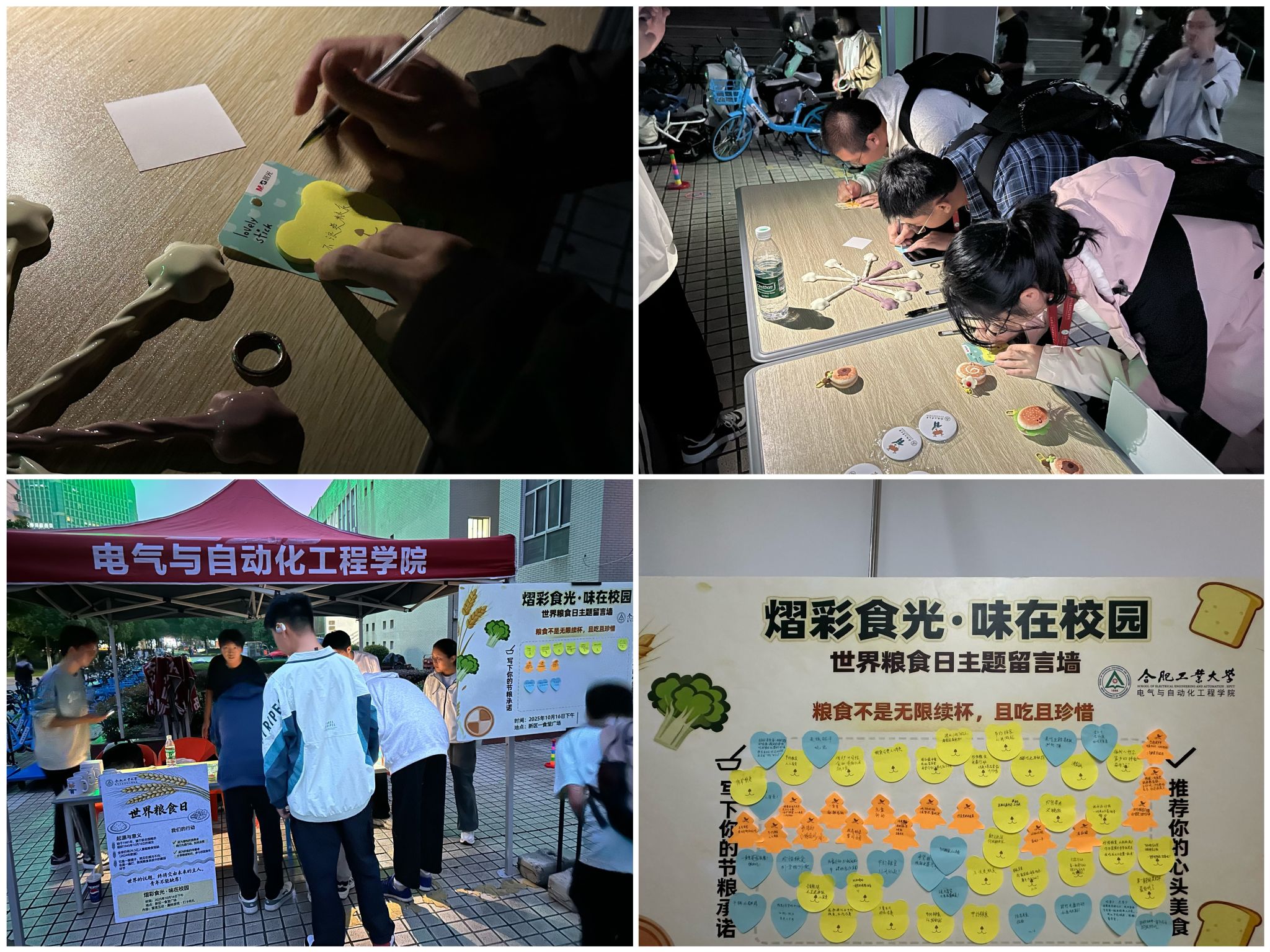 活动吸引百余名师生参与,同学们纷纷在便签纸上写下节粮承诺,并推荐校园及周边的特色美食。“按需取餐不浪费”“光盘行动”等真挚留言,汇聚成以“‘熠’彩食光·味在校园”为主题的主题展示墙。在工作人员的引导下,完成便签书写的同学参与了趣味互动。活动吸引大量师生在主题墙前驻足观看,大家用手机拍下暖心的惜粮留言,让节约粮食的良好氛围透过镜头,传递至更多地方。