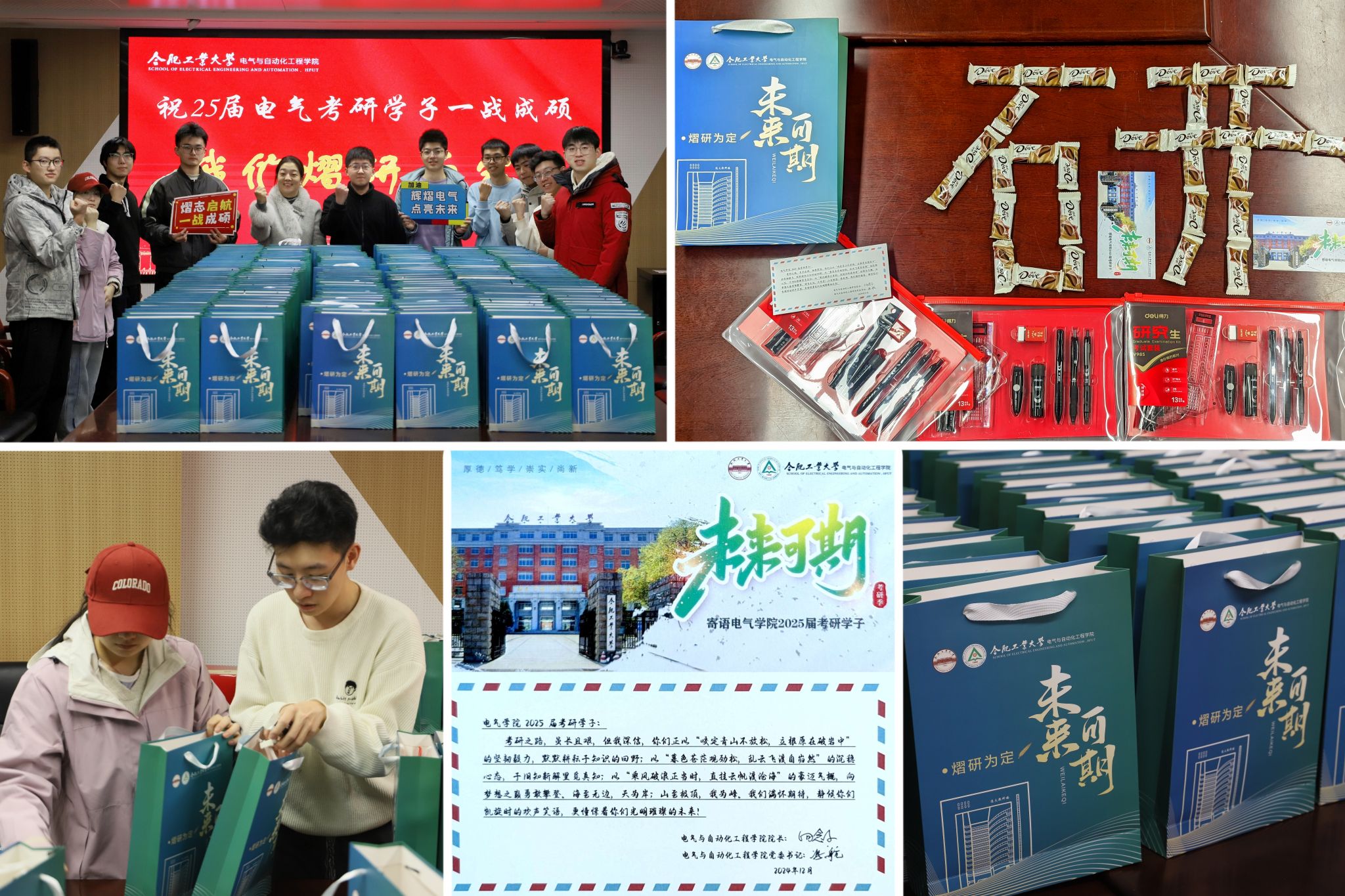 满满暖意,助力上岸。学院为220余名考研学子精心筹备了“辉熠电气”暖心礼包,内含寄语明信片、定制主题手提袋、笔试所需文具套装、巧克力糖果、温馨贴士卡等。学院党政领导撰写祝福寄语,在字里行间表达对莘莘学子的真切关怀;学生党员、推免生、团学骨干等组成的研途领航团队,有序完成各项派发前准备工作;文具护航,糖果充能,寄语传情,贴士保障,浓浓的暖意凝聚于礼包中。