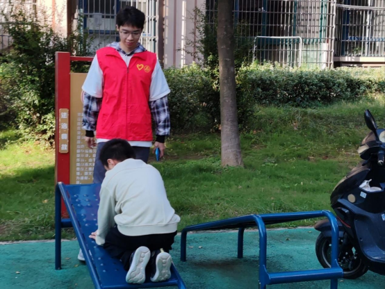 志愿服务现场,五名志愿者实行一对一结对照看,保障儿童课堂配合度。活动伊始,志愿者们围坐儿童身旁,通过共同玩玩具、拼拼图等互动方式,快速拉近与孩子的距离。随后,志愿者配合中心老师,陪同“星星的孩子”前往周边社区开展户外活动。志愿者全程悉心看护,协助孩子们尝试漫步机、攀爬阶梯等健身器材。志愿者的陪伴与协助既助力儿童锻炼身体机能,更为其搭建了融入社区的实践平台,每一次互动与微小进步均凝聚着志愿服务的温暖力量。