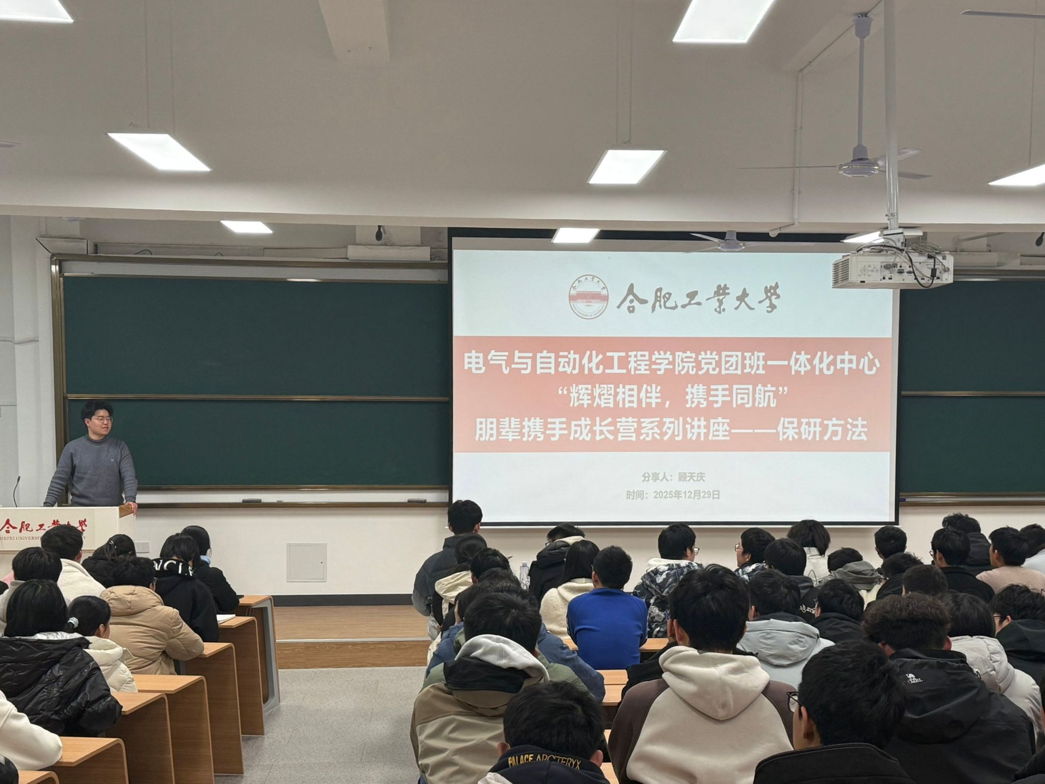 于翡翠湖校区2号教学楼举办“熠路领航,朋辈指引”优秀学子经验分享会。活动邀请2022级自动化专业本科生顾天庆担任主讲人,面向2025级新生分享学习经验与成长心得,助力新生明晰发展方向、规划大学生涯。