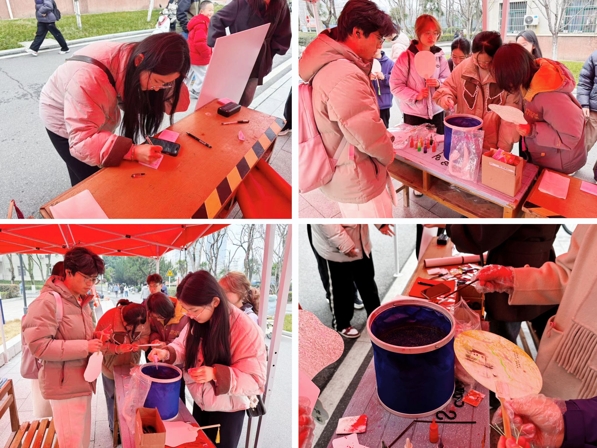 活动现场划分为三个区域。作品展示区集中陈列了“诗韵墨香”系列优秀书画作品及精品漆扇,通过学生讲解员介绍创作思路与作品内涵,吸引了不少同学驻足观看。诗词文化区设置了元宵主题诗词展板,张贴了与节日、新春相关的经典诗句。在心愿留言板上,同学们纷纷写下了对新学期的期许与祝福。在漆扇手工体验区,同学们学习基础绘制技巧,亲手制作了一把属于自己的漆扇。活动现场秩序井然,热闹非凡。