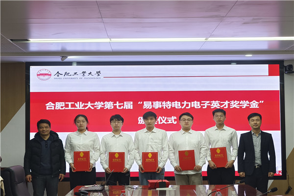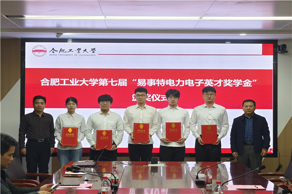 第七届“易事特电力电子英才奖学金”颁奖仪式举行。易事特新能源合肥有限公司总经理孙阿欢,易事特集团安徽公司副总经理李涛,易事特集团股份有限公司工程师刘芳红,以及学院相关负责人和获奖学生参加仪式。