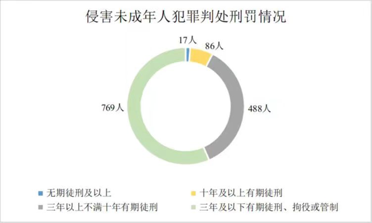 2022年,全省检察机关批准逮捕侵害未成年人犯罪1035人,提起公诉1687人。法院作出有罪判决1360人,其中无期徒刑及以上17人,占1.3%;十年及以上有期徒刑86人,占6.3%;三年以上不满十年有期徒刑488人,占35.9%;三年及以下有期徒刑、拘役或管制769人,占56.5%。