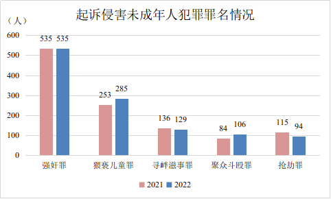 2.侵害未成年人犯罪罪名集中。起诉侵害未成年人犯罪人数居前五位的分别为强奸罪535人、猥亵儿童罪285人、寻衅滋事罪129人、聚众斗殴罪106人、抢劫罪94人。该五类犯罪人数占起诉侵害未成年人犯罪总人数68.1%。
